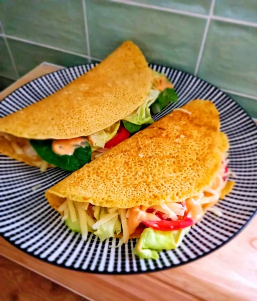 Egy növényi fehérje bomba, 5 perc alatt lehet natúr és zöldséges lapokat sütni csak víz hozzáadásával. Aki nem szereti a csicseriborsót és vöröslencsét annak nem ajánlom önmagában, mert karakteres íze van..
